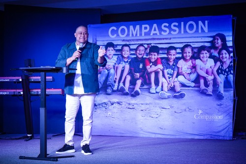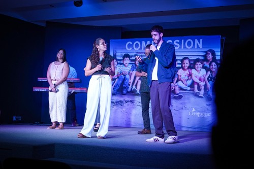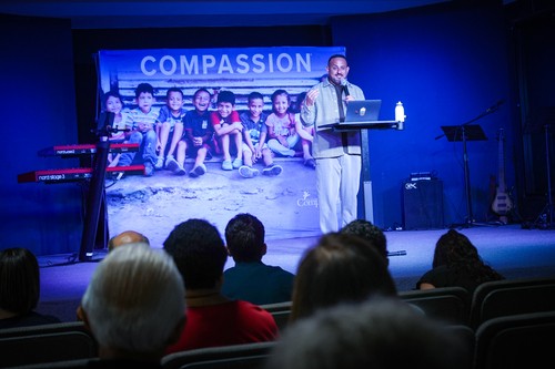 Samuel Polanco compartió su historia — criado en pobreza en República Dominicana, apadrinado por Compassion cuando era niño, hoy director nacional de Compassion. Una persona que decidió invertir en su vida lo cambió todo. Y al fondo del salón había 50 perfiles de niños con nombre, con rostro, con historia.